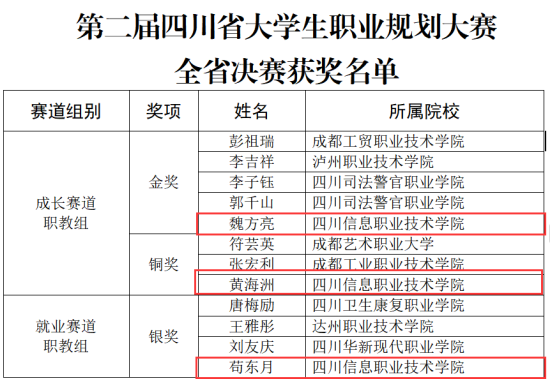 12月25日至27日,由四川省教育厅、四川省人力资源和社会保障厅联合主办的第二届四川省大学生职业规划大赛决赛,在西南医科大学和泸州职业技术学院成功举办。我院在大赛中喜获佳绩。电子与物联网学院电子信息工程技术专业学生魏方亮获职教组成长赛道金奖,现代制造学院智能制造装备技术专业学生苟东月和黄海洲分别获职教组就业赛道银奖和职教组成长赛道铜奖。