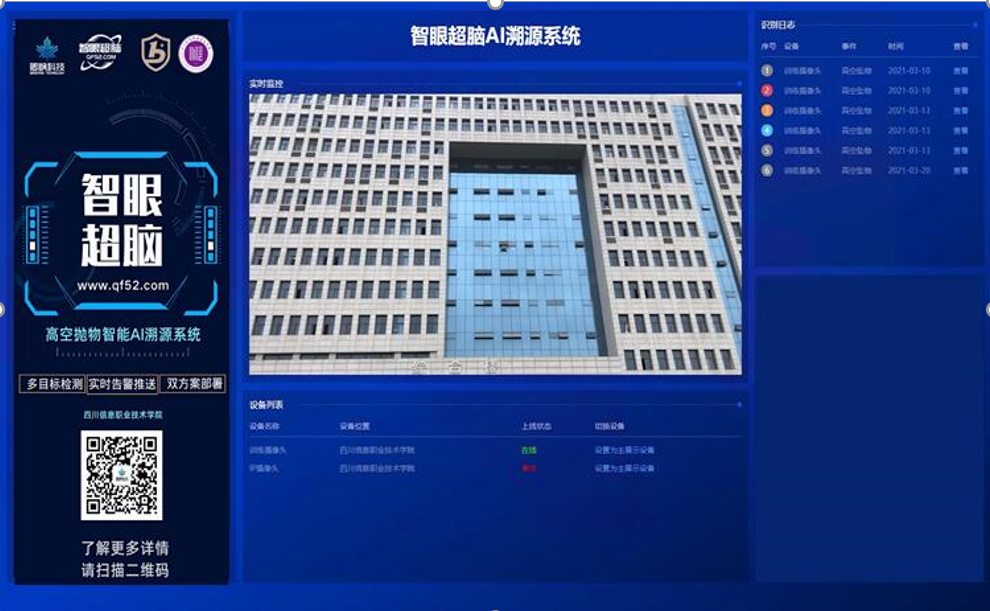 随着城市现代化飞速发展,不少高空抛物、坠物事件已然成为危害人民生命及财产安全的重大隐患!日常生活中,高空抛物对我们的生活造成了很大的困扰。为解决高空抛物这一不良现象,溯源极为重要。我院的大学生创新创业项目“智眼超脑——高空抛物溯源系统助力基层数字化治理”便来源于此。为解决高空抛物溯源问题,该项目的负责人卿博及他的创新创业团队朝思夕计,从实际生活出发,解决高空抛物的溯源问题。该项目在四川省第六届“互联网+”大学生创新创业大赛职教赛道获得了项目银奖。